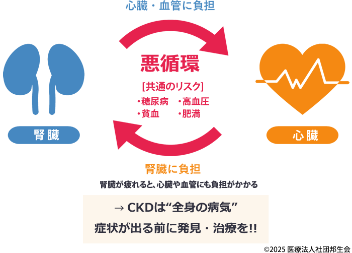 - 腎臓が悪化 → 血圧上昇 → 心臓・血管に負担