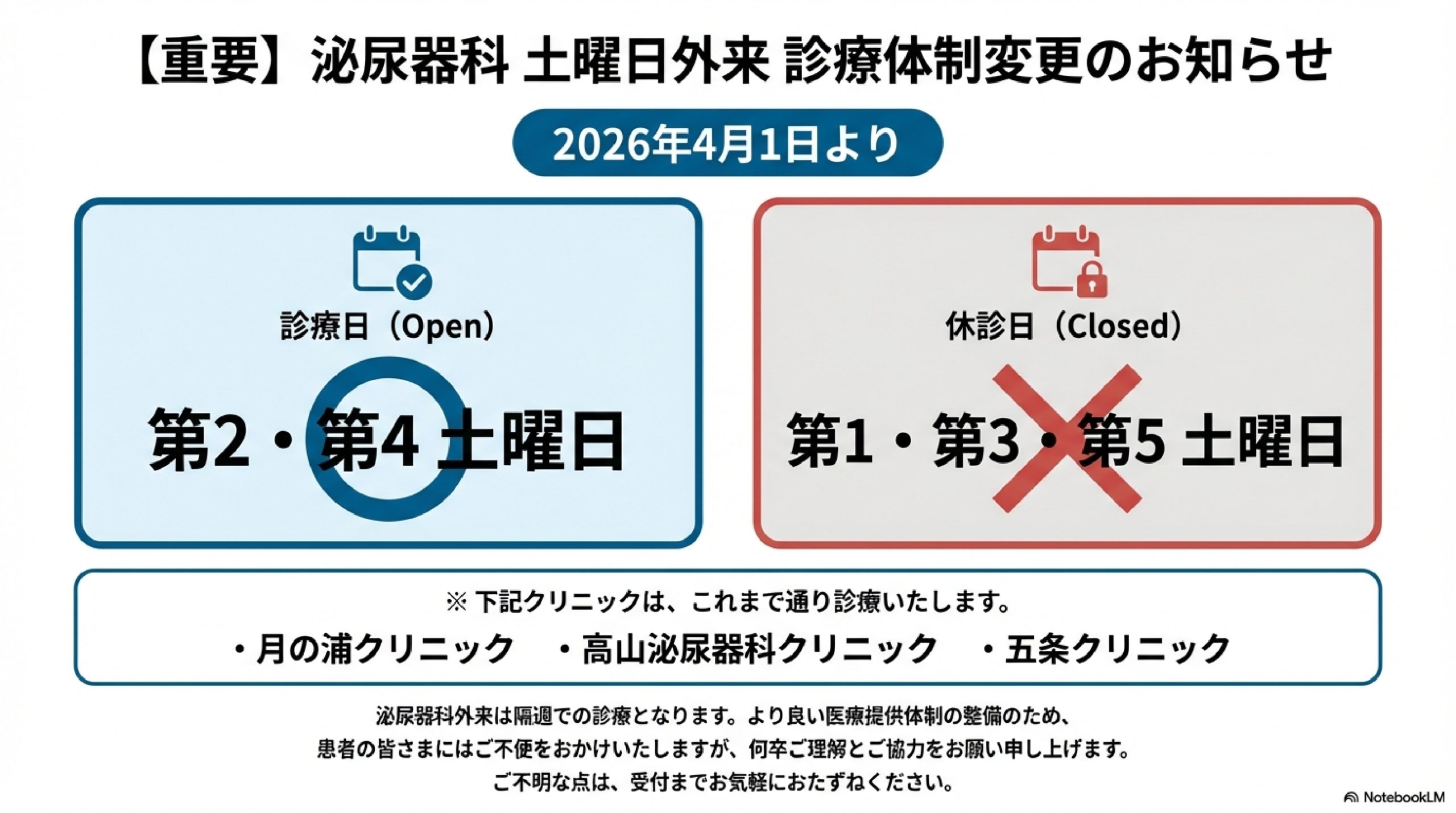 2026年4月1日より 土曜日外来 診療体制変更のお知らせ