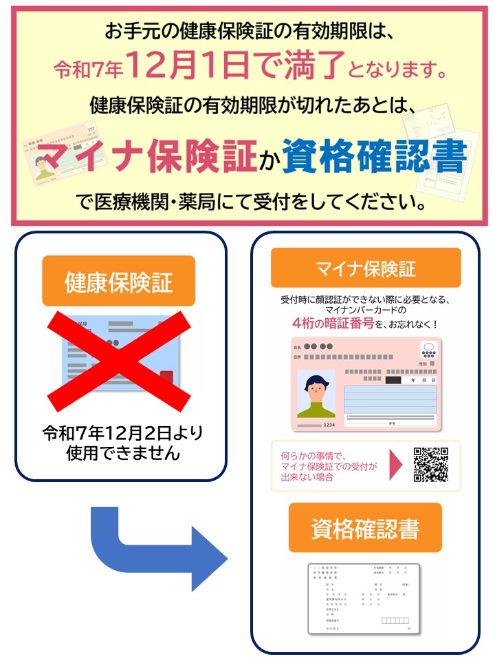 12月2日から健康保険証はご利用できません 2025年11月25日 お知らせ 下記の通り、従来の健康保険証は2025年12月2日からご利用いただけません。 12月2日以降の受診の際には、マイナ保険証または資格確認書のご持参をお願い致します。 なお、マイナ保険証・資格確認書は同じ月に2回以上受診される場合も、毎回確認が必要となります。 大変恐れ入りますが、ご理解とご協力の程よろしくお願い申し上げます。