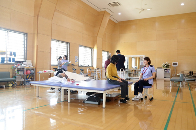 - リハビリ室到着後、まずは、体温や脈拍、呼吸や血圧などを測定いたします。次に、病状や精神面などの健康状態を確認します。